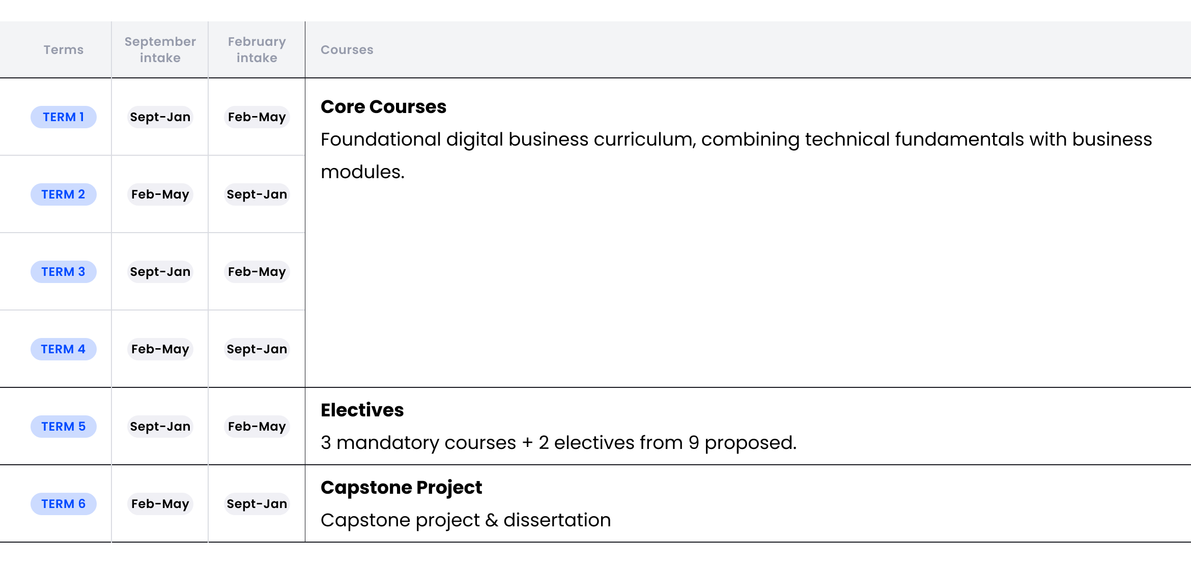 The Bachelor’s is structured with 5 Terms of courses and 1 final Term for the dissertation/project. In Term 5, you have 3 compulsory modules in Digital Business and can then pick 2 elective courses out of 9 based on your interests.